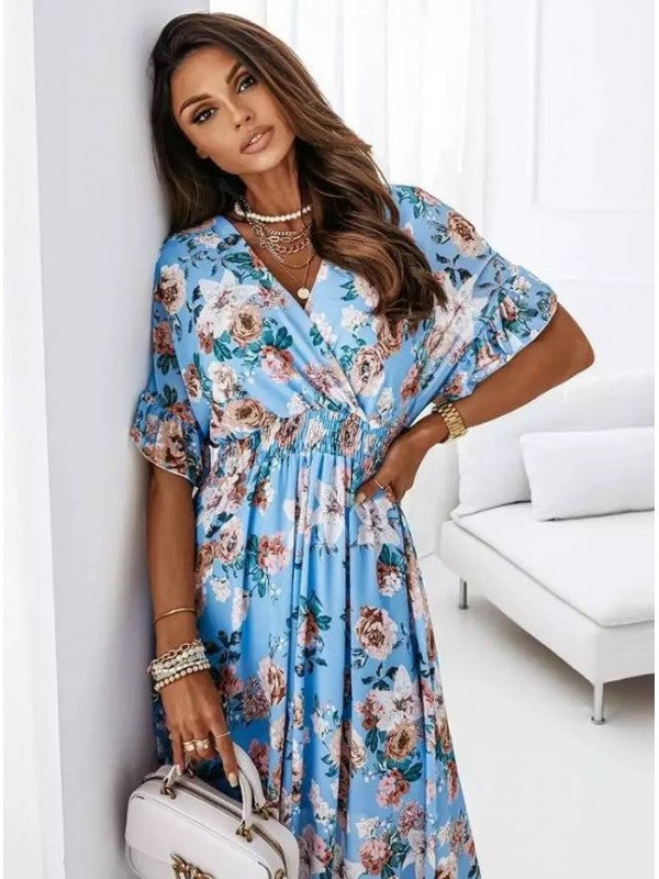 De delicate [grootte van de bloemen] bloemen in zachte [kleuren] kleuren creëren een tijdloos en vrouwelijk patroon tegen een achtergrond van zachtblauw chiffon. De V-halslijn accentueert je gezicht, terwijl de tailleband je figuur prachtig omhult. De zwierige rok en de licht gepofte mouwen zorgen voor een speelse en elegante touch.